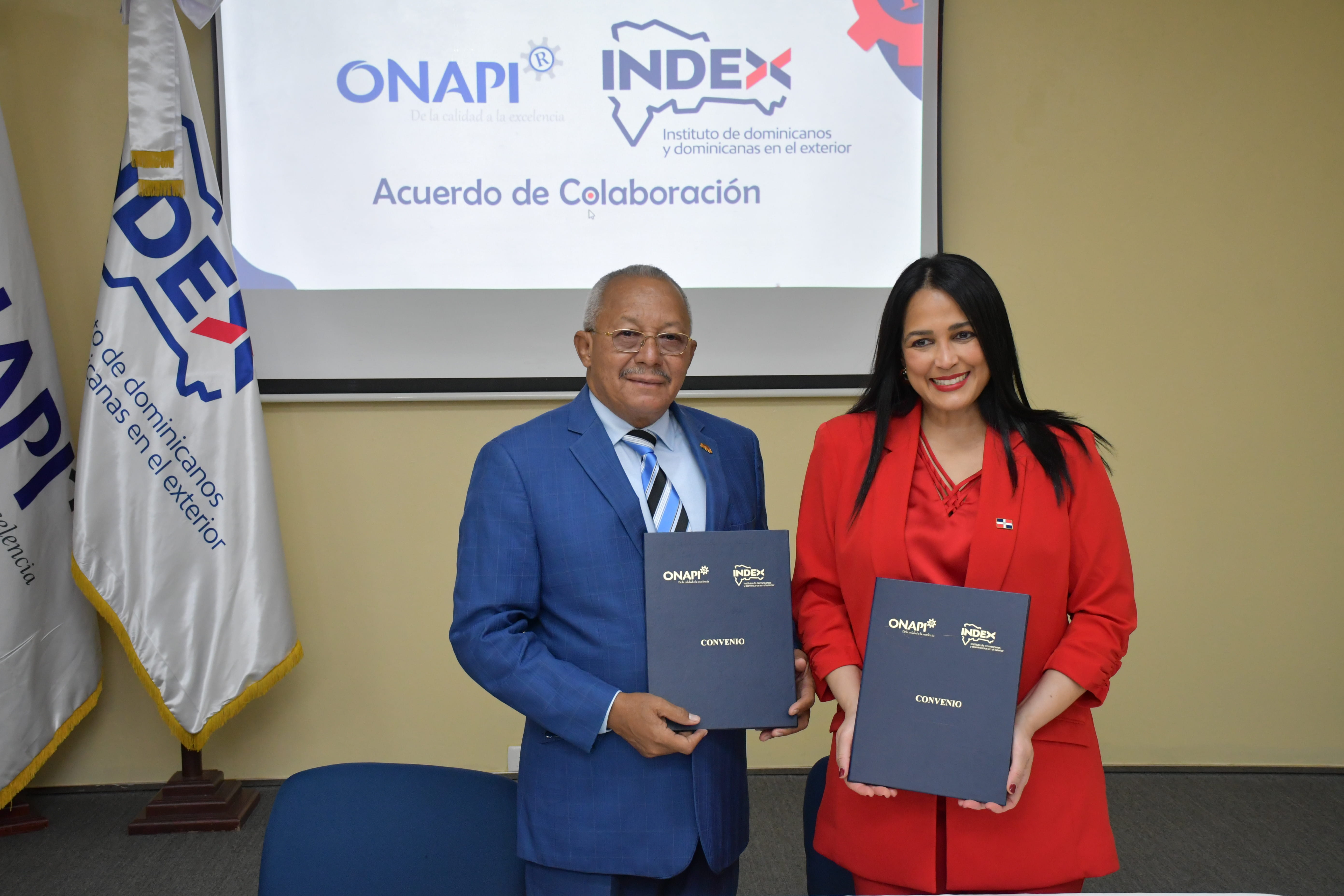 Santo Domingo, D.N.- La Oficina Nacional de la Propiedad Industrial (ONAPI) y el Instituto de Dominicanas y Dominicanos en el Exterior (INDEX), firmaron un acuerdo de colaboración interinstitucional, con el propósito de proteger la innovación de los dominicanos en el exterior, en el marco de sus misiones institucionales.